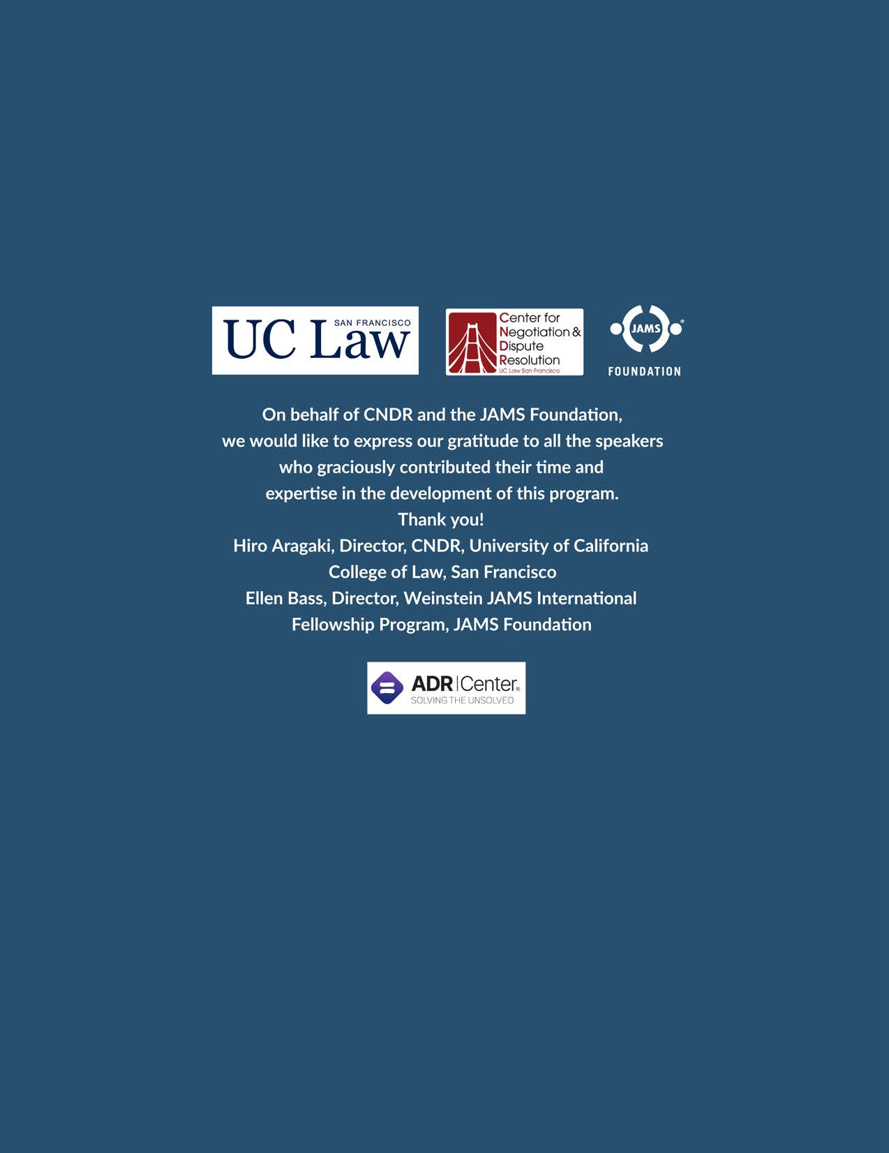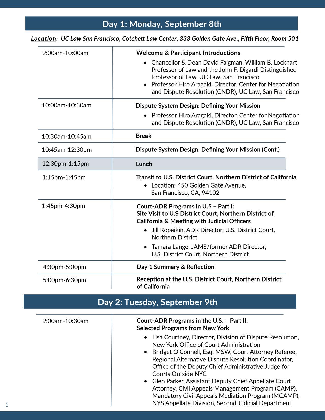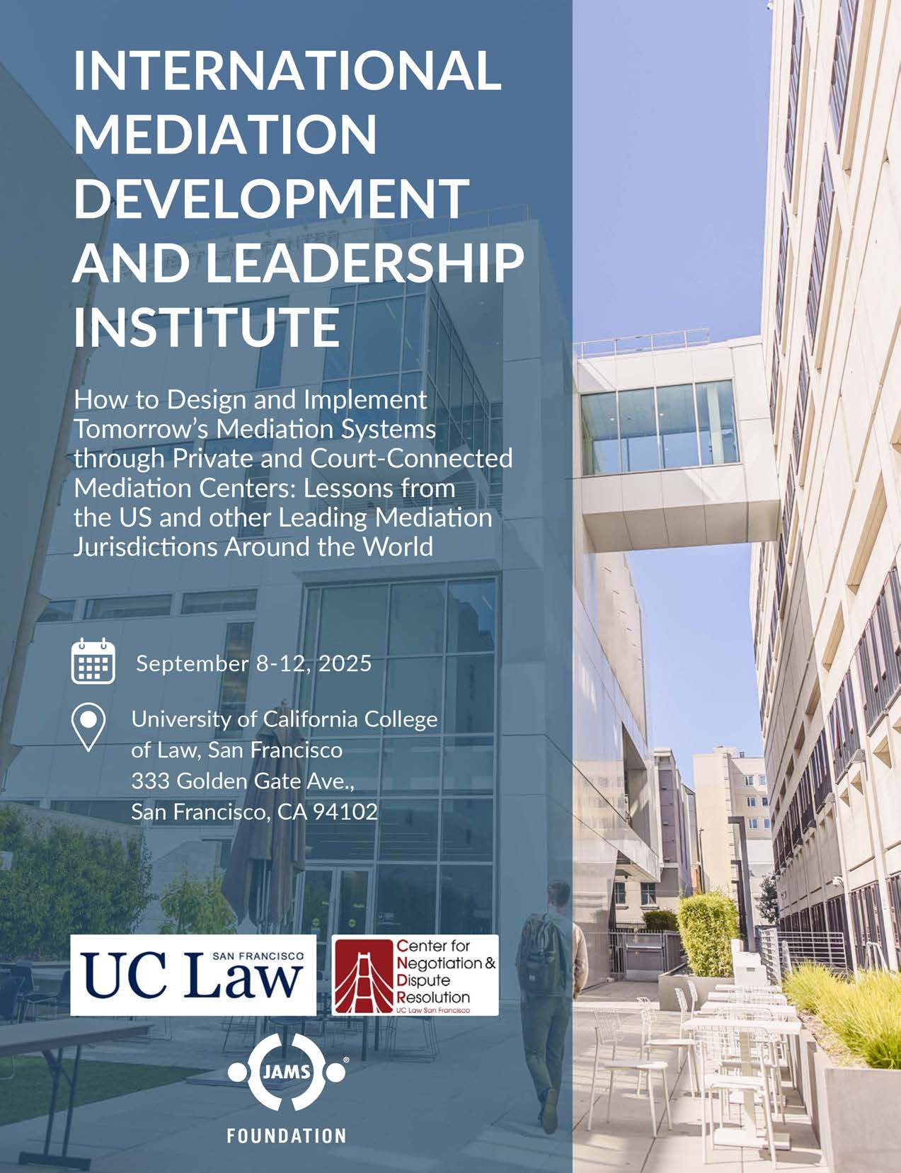 The UC Law San Francisco Center for Negotiation and Dispute Resolution (CNDR), at the University of California College of Law, San Francisco, in partnership with the JAMS Foundation, is proud to present the International Mediation Development & Leadership Institute (IMDLI). IMDLI is intended for a diverse group of professionals—lawyers, judges, court administrators, academics, mediators, and others—interested in learning how to cultivate robust mediation ecosystems in their home countries and how to become an effective leader of mediation implementation and development. Top-level U.S. and international experts drawn from the court system, private ADR institutions, and universities will share best practices and lessons learned from decades of ADR reform experience—information that is rarely available to the public. Anticipated topics covered: