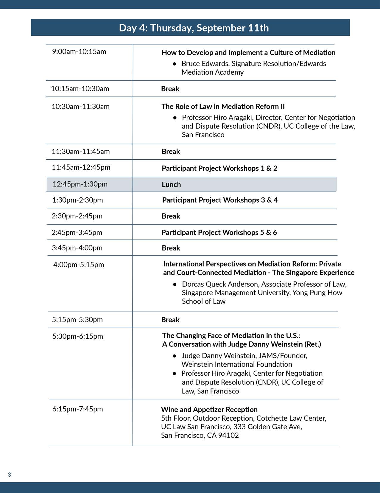 - “The topics on mediation ecosystems, culture, civil/common law approaches provided a wealth of intellectual content and well as practical content.”—Anonymous