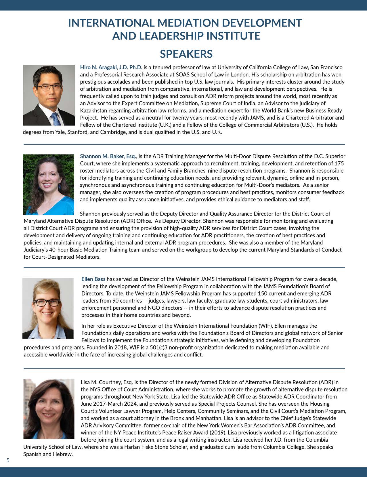 Ellen Bass has served as Director of the Weinstein JAMS International Fellowship Program for over a decade, leading the development of the Fellowship Program in collaboration with the JAMS Foundation’s Board of Directors and Judge Danny Weinstein (Ret.). To date, the Weinstein JAMS Fellowship Program has supported 145 current and emerging ADR leaders from 85 countries — judges, lawyers, law faculty, graduate law students, court administrators, law enforcement personnel and NGO directors — in their efforts to advance dispute resolution practices and processes in their home countries and beyond. In her role as Executive Director of the Weinstein International Foundation (WIF), Ellen manages the Foundation’s daily operations and works with the Foundation’s Board of Directors and global network of Senior Fellows to implement the Foundation’s strategic initiatives, while defining and developing Foundation procedures and programs. Founded in 2018, WIF is a 501(c)3 non-profit organization dedicated to making mediation available and accessible worldwide in the face of increasing global challenges and conflict. An attorney and trained mediator, Ellen served as co-mediator and assistant to Bruce Edwards from 2011-2018. A member of the California State Bar, she earned her J.D. from the University of San Francisco, School of Law, where she was selected as a Research Fellow to the McCarthy Institute for Intellectual Property in 2008. She further served on Law Review, the Moot Court Honors program, and was a finalist for the Advocate of the Year Award. She is a graduate of the University of California at Berkeley (magna cum laude) and recipient of a Fulbright Fellowship to Berlin, Germany, where she studied philosophy and comparative literature at the Freie Universität.