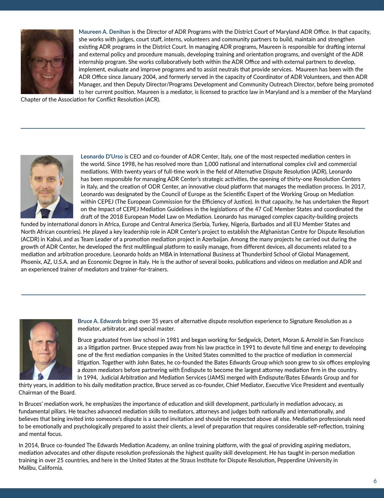 Bruce A. Edwards brings over 35 years of alternative dispute resolution experience to Signature Resolution as a media tor, arbitrator, and special master. Edwards graduated from law school in 1981 and began working for Sedgwick, Detert, Moran & Arnold in San Francisco as a litigation partner. Edwards stepped away from his law practice in 1991 to de vote full time and energy to developing one of the first mediation companies in the United States committed to the practice of mediation in commercial litigation. Together with John Bates, he c o-founded the Bates Edwards Group which soon grew to six offices employing a dozen mediators before partnering with Endispute to become the largest attorney mediation firm in the country. In 1994, Judicial Arbitration and Mediation Services merged with Endispute/Bates Edwards Group and for thirty years, in addition to his daily meditation practice, Edwards served as c o-founder, Chief Mediator, Executive Vice President and eventually Chairman of the Board. In Edwards’ mediation work, he emphasizes the importance of education and skill development, particularly in mediation advocacy, as fundamental pillars. He teaches advanced mediation skills to mediators, attorneys and judges both nationally and internationally, and believes that being invited into someone’s dispute is a sacred invitation and should be respected above all else. Mediation professionals need to be emotionally and psychologically prepared to assist t their clients, a level of preparation that requires considerable self-reflection, training and mental focus. In 2014, Edwards co-founded The Edwards Mediation Academy, an online training platform, with the goal of providing aspiring mediators, mediation advocates and other dispute resolution professionals the highest quality skill development. He has taught in-person mediation training in over 25 countries, and here in the United States at the Straus Institute of Dispute Resolution, Pepperdine University in Malibu, California.