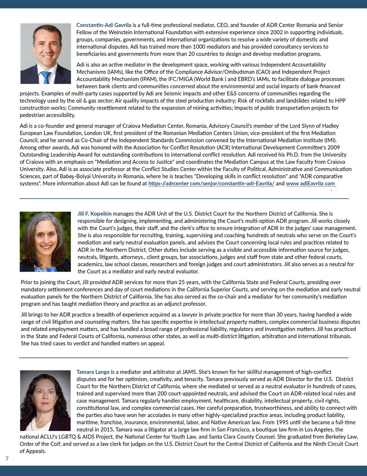 Constantin-Adi Gavrilă is a full-time professional mediator, CEO, and founder of ADR Center Romania and Senior Fellow of the Weinstein International Foundation with extensive experience since 2002 in supporting individuals, groups, companies, governments, and international organizations to resolve a wide variety of domestic and international disputes. Adi has trained more than 1000 mediators and has provided consultancy services to beneficiaries and governments from more than 20 countries to design and develop mediation programs. Adi is also an active mediator in the development space, working with various Independent Accountability Mechanisms (IAMs), like the Office of the Compliance Advisor/Ombudsman (CAO) and Independent Project Accountability Mechanism (IPAM), the IFC/MIGA (World Bank) and EBRD’s IAMs, to facilitate dialogue processes between the bank clients and communities concerned about the environmental and social impacts of bank-financed projects. Examples of multi-party cases supported by Adi are Seismic impacts and other E&S concerns of communities regarding the technology used by the oil & gas sector; Air quality impacts of the steel production industry; Risk of rockfalls and landslides related to HPP construction works; Community resettlement related to the expansion of mining activities; Impacts of public transportation projects for pedestrian accessibility. Adi is a co-founder and general manager of Craiova Mediation Center, Romania, Advisory Council’s member of the Lord Slynn of Hadley European Law Foundation, London UK, first president of the Romanian Mediation Centers Union, vice-president of the first Mediation Council, and he served as Co-Chair of the Independent Standards Commission convened by the International Mediation Institute (IMI). Among other awards, Adi was honored with the Association for Conflict Resolution (ACR) International Development Committee’s 2009 Outstanding Leadership Award for outstanding contributions to international conflict resolution. Adi received his Ph.D. from the University of Craiova with an emphasis on “Mediation and Access to Justice” and coordinates the Mediation Campus at the Law Faculty from Craiova University. Also, Adi is as associate professor at the Conflict Studies Center within the Faculty of Political, Administrative and Communication Sciences, part of Babeş-Bolyai University in Romania, where he is teaching “Developing skills in conflict resolution” and “ADR comparative systems”. More information about Adi can be found at https://adrcenter.com/senior/constantin-adi-gavrila/ and www.adigavrila.com.
