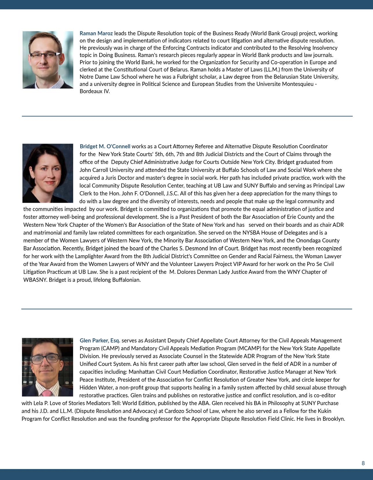 Glen Parker, Esq. serves as Assistant Deputy Chief Appellate Court Attorney for the Civil Appeals Management Program (CAMP) and Mandatory Civil Appeals Mediation Program (MCAMP) for the New York State Appellate Division. He previously served as Associate Counsel in the Statewide ADR Program of the New York State Unified Court System. As his first career path after law school, Glen has served in the field of ADR in a number of capacities including: Manhattan Civil Court Mediation Coordinator, Restorative Justice Manager at New York Peace Institute, President of the Association for Conflict Resolution of Greater New York, and circle keeper for Hidden Water, a non-profit group that supports healing in a family system affected by child sexual abuse through restorative practices. Glen trains and publishes on restorative justice and conflict resolution, and is co-editor with Lela P. Love of Stories Mediators Tell: World Edition, published by the ABA. Glen received his B.A. in Philosophy at SUNY Purchase and his J.D. and LL.M. (Dispute Resolution and Advocacy) at Cardozo School of Law, where he also served as a Fellow for the Kukin Program for Conflict Resolution and was the founding professor for the Appropriate Dispute Resolution Field Clinic. He lives in Brooklyn.