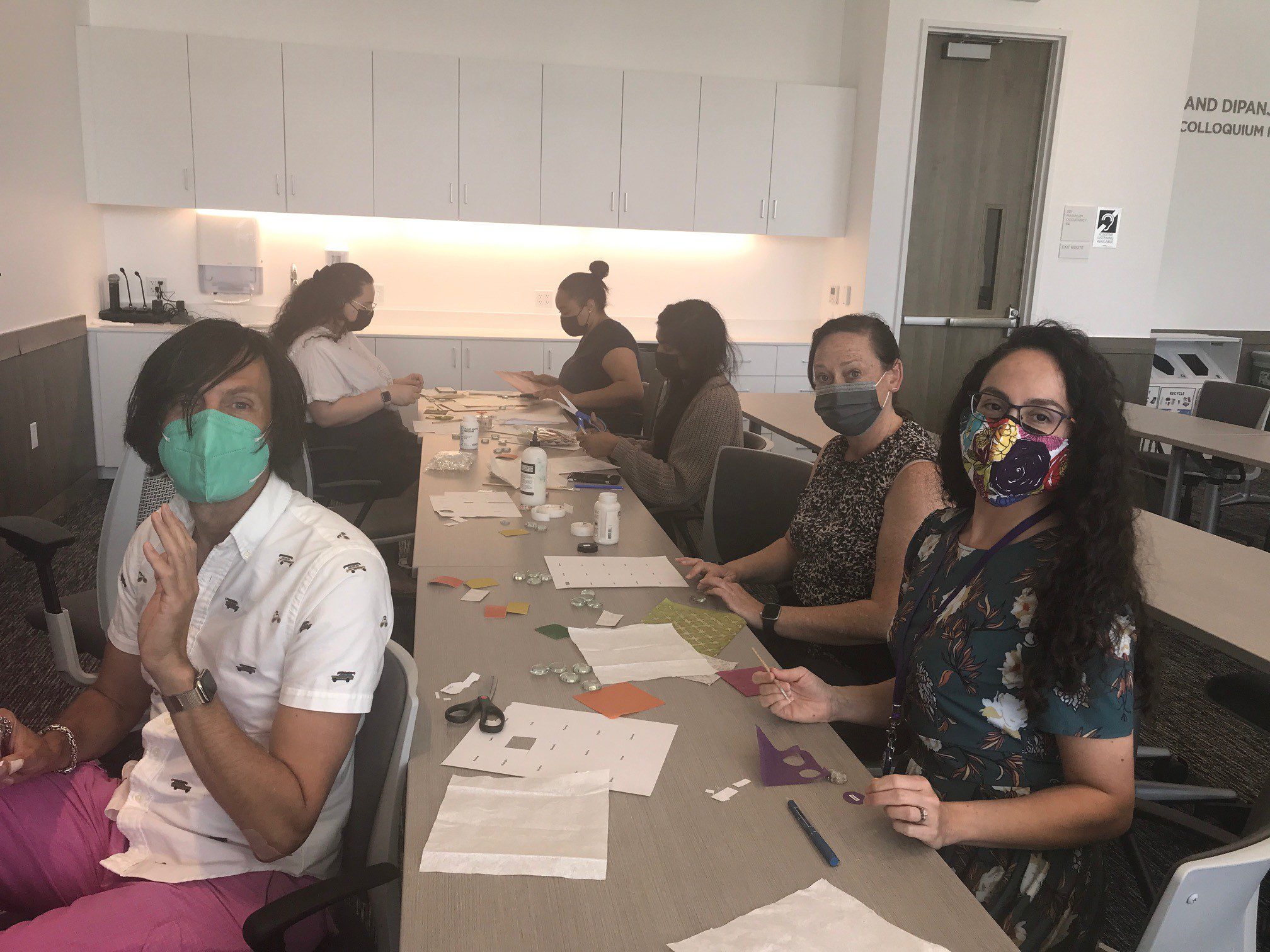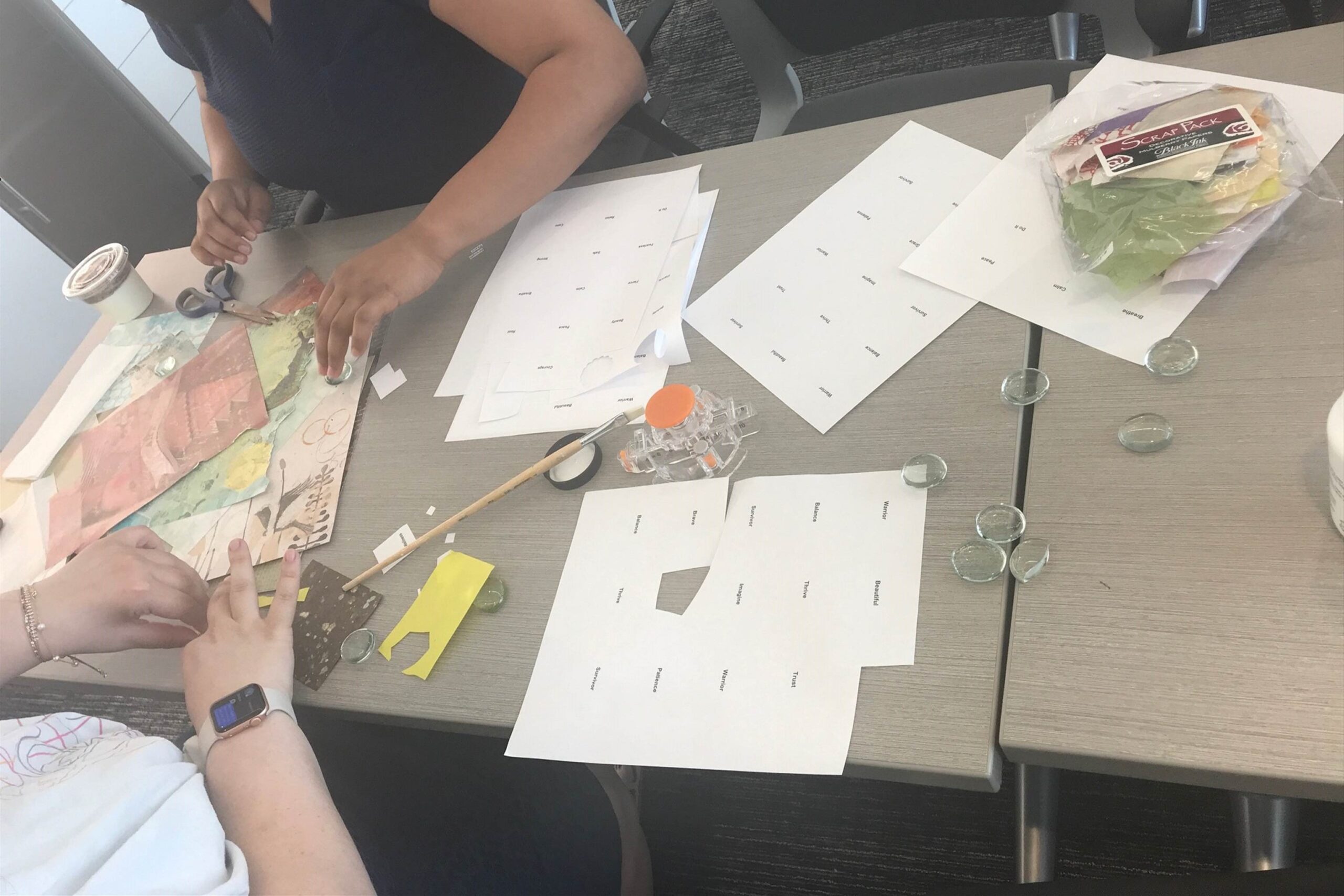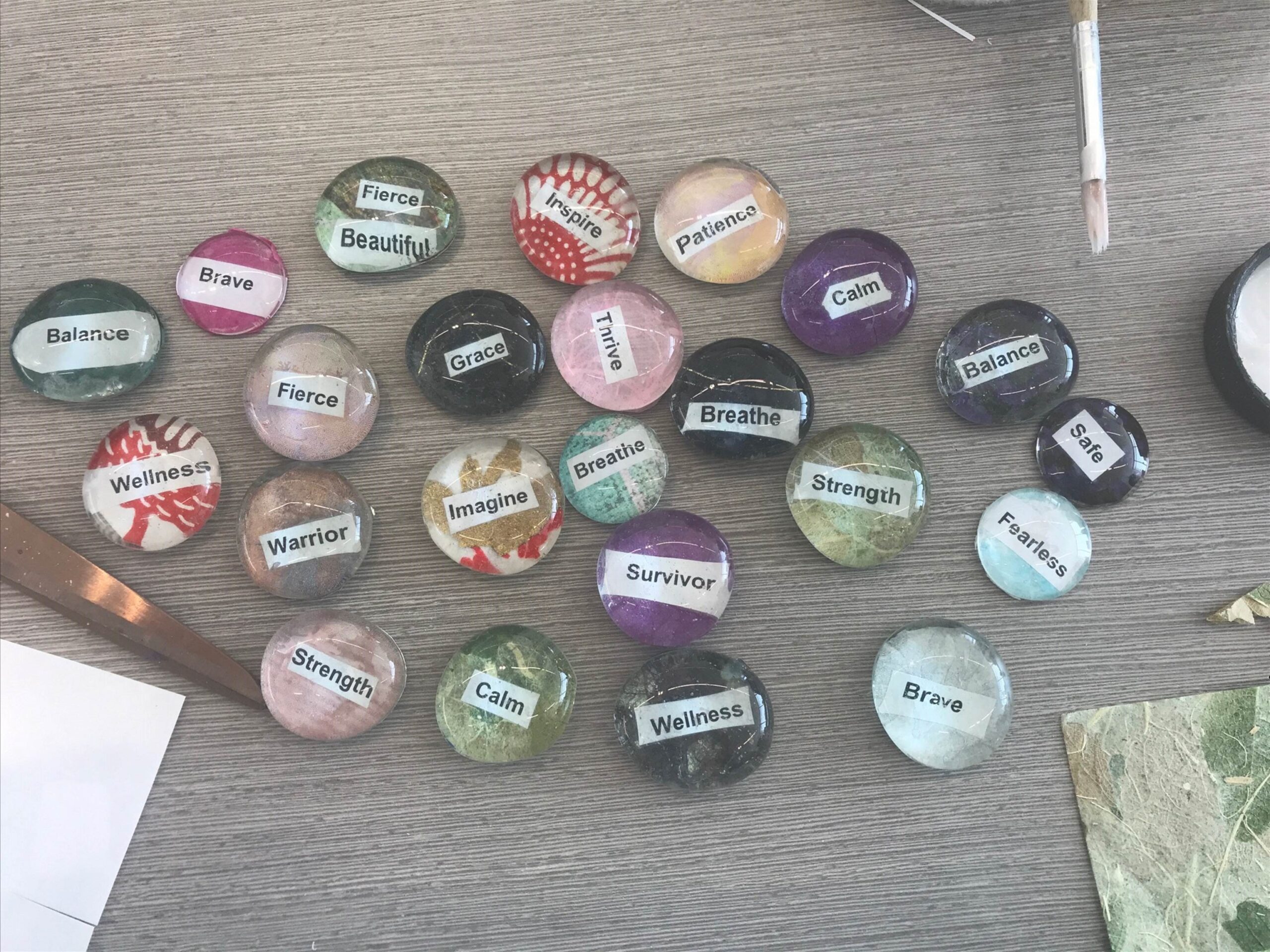 Lisa led the group in an arts and crafts activity creating “worry stones” to be used as a grounding tool; these stones will be available to community members visiting the CARE or DRP offices. Worry stones are small, smooth, clear-backed gemstones used for relaxation or anxiety relief. The stones we created include a magnified affirmation word and a colorful background of various paper materials, with an option for velcro on the back for added texture. The stones can be carried around and touched or rubbed any time you need a reminder of your strength and perseverance. Thank you to Lisa and all who participated!