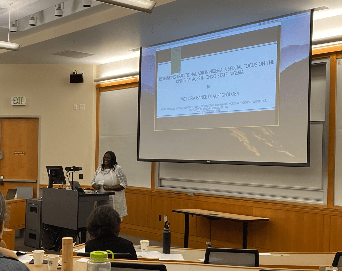 Banke Olagbegi-Oloba, a fall 2022 Affiliated Scholar at The Center for Negotiation and Dispute Resolution (CNDR), presented at the AALS ADR Section’s Works-In-Progress (WIP) Conference. The Conference, held from October 6-8 at the University of Oregon in Eugene, was hosted by the Law School’s Appropriate Dispute Resolution Center. Since 2007, WIP has brought together dispute resolution scholars and researchers to share their ideas and discuss their work in a rigorous and collegial atmosphere. The goal of the WIP is to cultivate a supportive environment for participants to learn from one another.