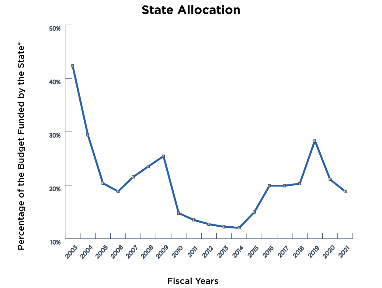 *Based on percent to total college and foundation revenue; 2019 includes additional funding from the California Scholars Program to support students from Historically Black Colleges and Universities.