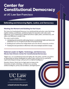 “Right now, our constitutional and civil rights, the rule of law, and the very fabric of democracy are being challenged on many fronts, and we are in a period of rapid technological change with growth in artificial intelligence. I am honored to lead the new Center for Constitutional Democracy at UC Law SF at this critical time and drive innovative work to defend and advance rights, justice, and democracy, and make a real difference in people’s lives. Together, we will meet the moment and build for the future.”