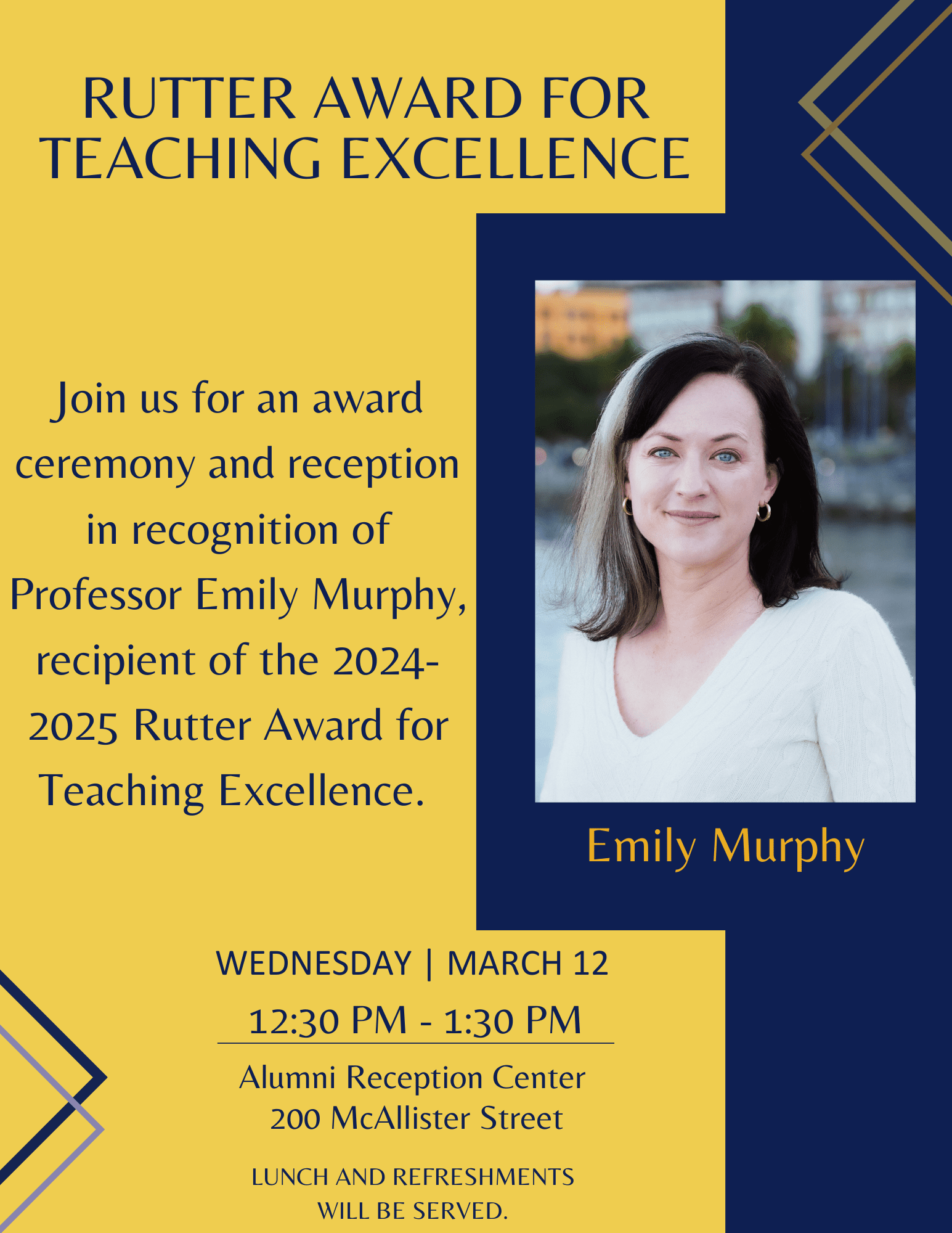 Please join us for an award ceremony and reception in recognition of Professor Emily Murphy, recipient of the 2024-2025 Rutter Award for Teaching Excellence.