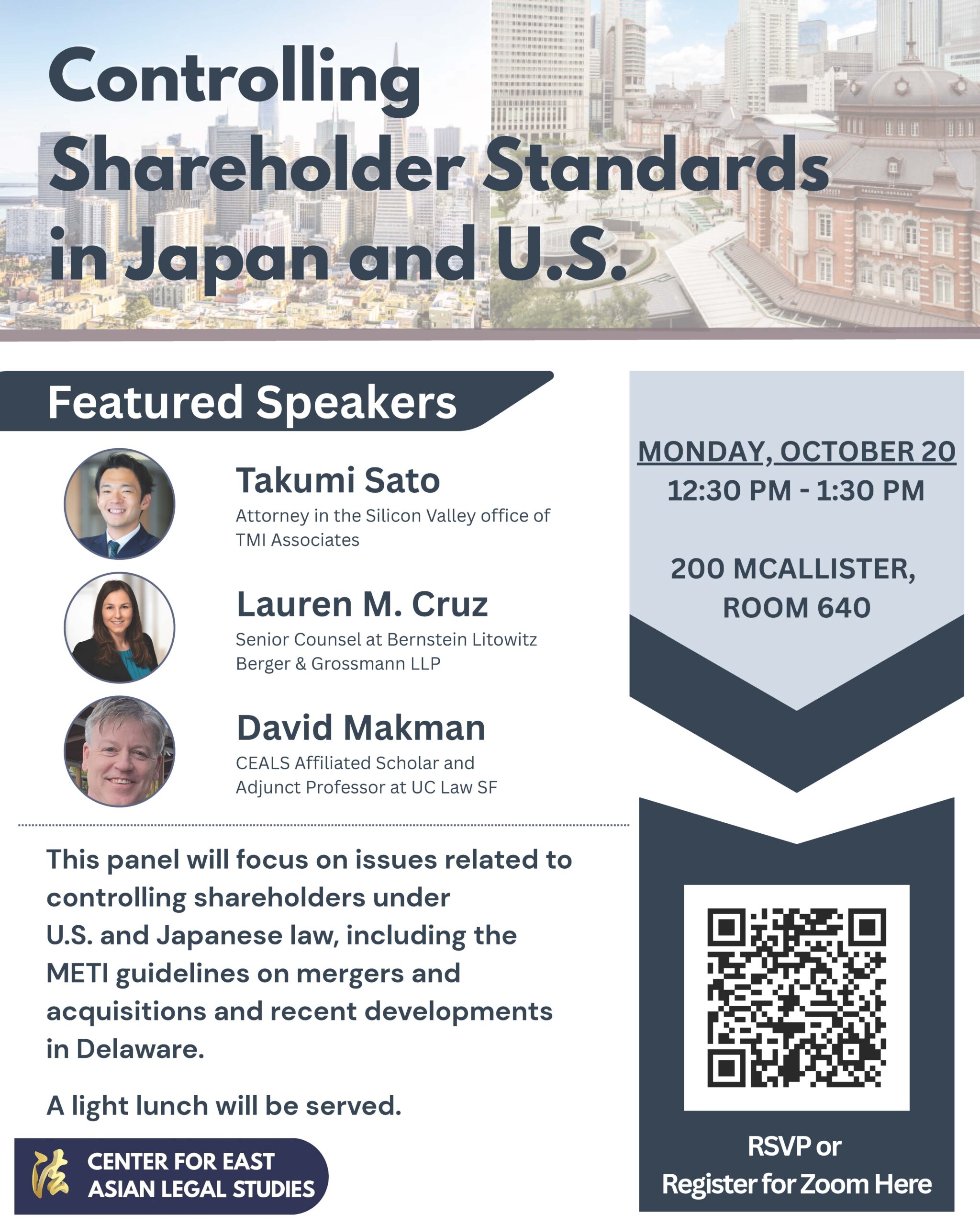 Featured Speakers: Takumi Sato, attorney in the Silicon Valley office of TMI Associates, Lauren M. Cruz, Senior Counsel at Bernstein Litowitz Berger & Grossmann LLP, and Adjunct Professor David Makman