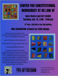The Center for Constitutional Democracy in collaboration with the Fall of Freedom will hosting an open house and an Art Show by Pablo Manga on January 13, 2026 from 2:00pm – 4:00pm in the 625 and 626 offices in the 200 McAllister Building. The art exhibit will run from January 13 to February 13.
