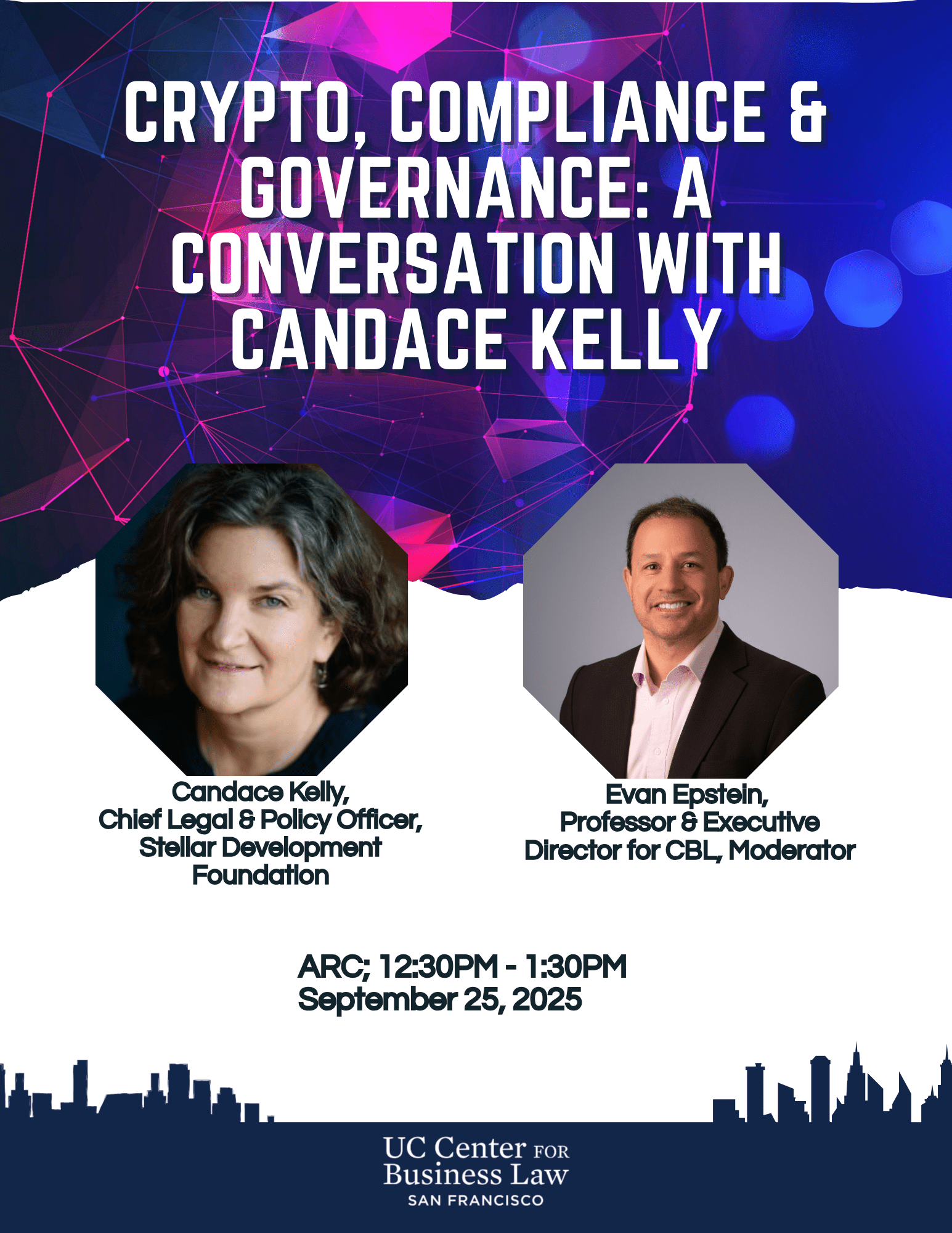 The discussion will be moderated by Professor Evan Epstein, Executive Director of the UC Center for Business Law SF. Don’t miss this opportunity to hear directly from a leader shaping the future of crypto regulation and governance, and to network with peers over lunch.