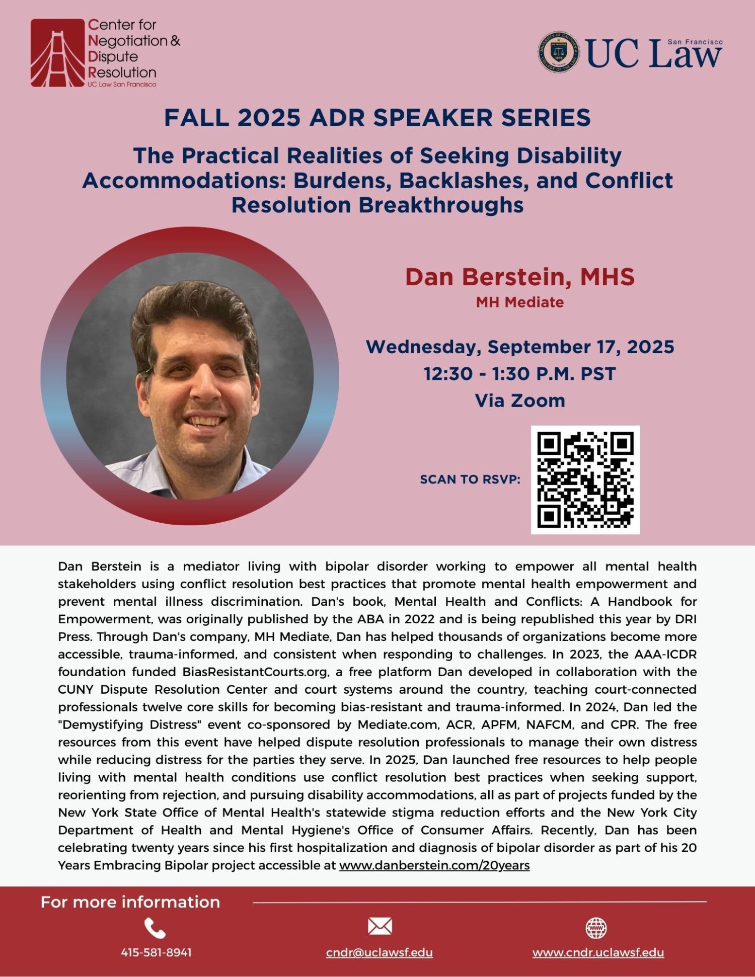 Dan Berstein is a mediator living with bipolar disorder working to empower all mental health stakeholders using conflict resolution best practices that promote mental health empowerment and prevent mental illness discrimination. Dan’s book, Mental Health and Conflicts: A Handbook for Empowerment, was originally published by the ABA in 2022 and is being republished this year by DRI Press. Through Dan’s company, MH Mediate, Dan has helped thousands of organizations become more accessible, trauma-informed, and consistent when responding to challenges. In 2023, the AAA-ICDR foundation funded BiasResistantCourts.org, a free platform Dan developed in collaboration with the CUNY Dispute Resolution Center and court systems around the country, teaching court-connected professionals twelve core skills for becoming bias-resistant and trauma-informed. In 2024, Dan led the “Demystifying Distress” event co-sponsored by Mediate.com, ACR, APFM, NAFCM, and CPR. The free resources from this event have helped dispute resolution professionals to manage their own distress while reducing distress for the parties they serve. In 2025, Dan launched free resources to help people living with mental health conditions use conflict resolution best practices when seeking support, reorienting from rejection, and pursuing disability accommodations, all as part of projects funded by the New York State Office of Mental Health’s statewide stigma reduction efforts and the New York City Department of Health and Mental Hygiene’s Office of Consumer Affairs. Recently, Dan has been celebrating twenty years since his first hospitalization and diagnosis of bipolar disorder as part of his 20 Years Embracing Bipolar project accessible at www.danberstein.com/20years