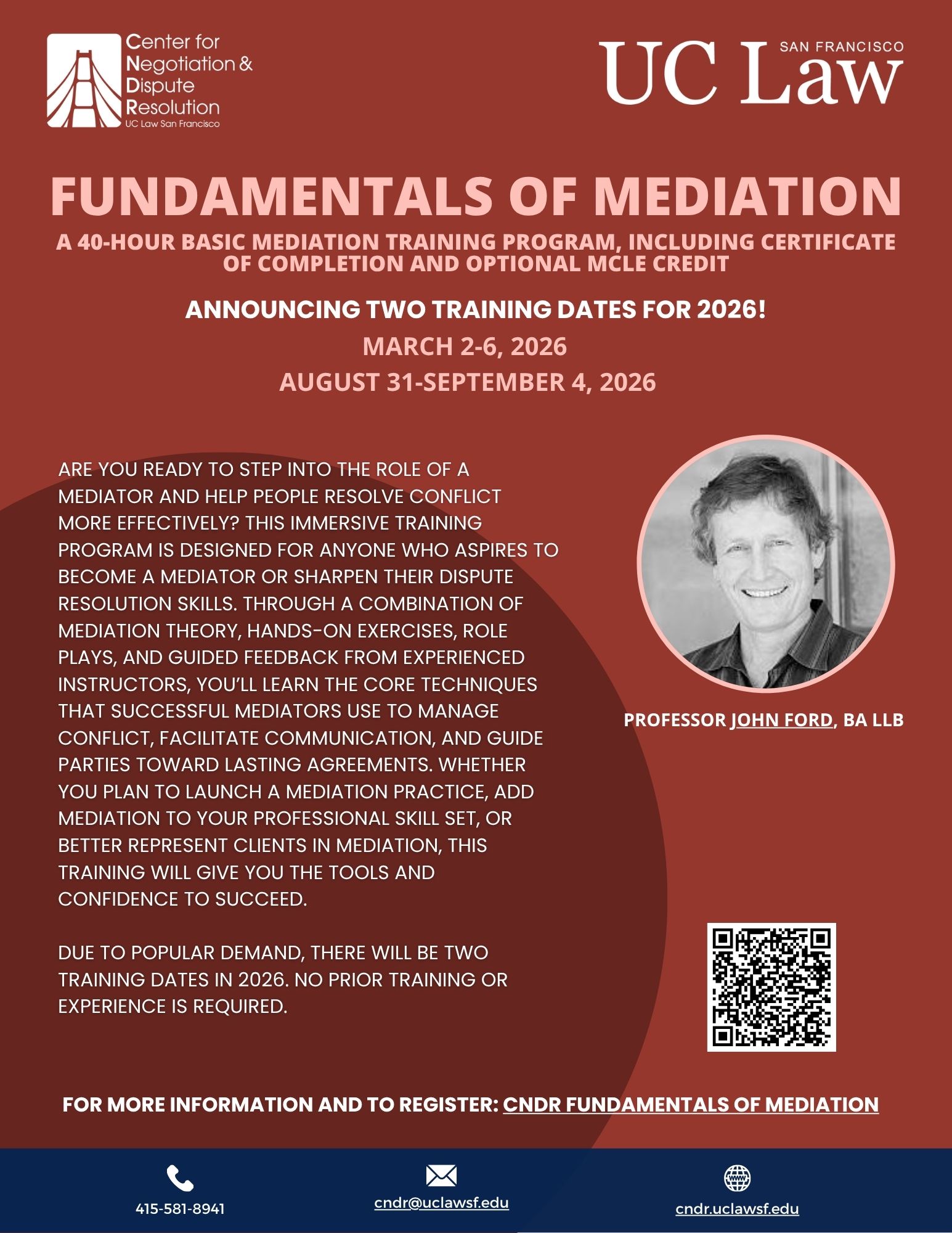 The UC Law SF Center for Negotiation and Dispute Resolution (CNDR) presents its’ annual 40-hour comprehensive mediation practitioner training. This program provides a unique blend of mediation theory, hands-on mediation skills training, and an exploration of the sensibilities and personal qualities required to be an effective mediator.