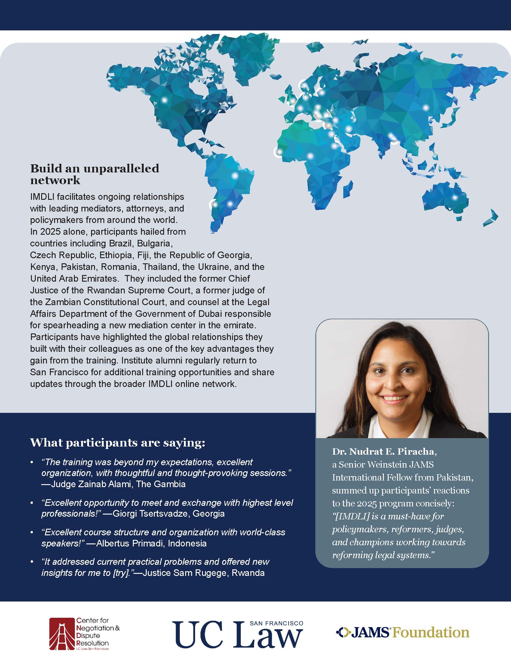The UC Law San Francisco Center for Negotiation and Dispute Resolution (CNDR), at the University of California College of Law, San Francisco, in partnership with the JAMS Foundation, is proud to present the International Mediation Development & Leadership Institute (IMDLI). IMDLI is intended for a diverse group of professionals—lawyers, judges, court administrators, academics, mediators, and others—interested in learning how to cultivate robust mediation ecosystems in their home countries and how to become an effective leader of mediation implementation and development. Top-level U.S. and international experts drawn from the court system, private ADR institutions, and universities will share best practices and lessons learned from decades of ADR reform experience—information that is rarely available to the public. Anticipated topics covered: